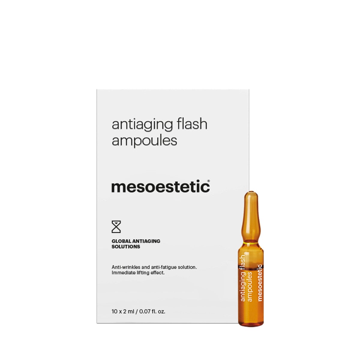 De geconcentreerde formule bevat een combinatie van anti-aging ingrediënten die synergetisch werken om rimpels en expressielijnen glad te strijken en geeft een meer uitgerust en stralend uiterlijk. Mesoestetic Antiaging Flash Ampul is een intensieve anti-aging behandeling voor alle huidtypen die, wereldwijd, tegen de tekenen van huidveroudering werken en zorgt voor een onmiddellijk anti-vermoeidheids- en lifting-effect. De geconcentreerde formule bevat een combinatie van uitstekende anti-aging ingrediënten die synergetisch werken om rimpels en expressielijnen te verminderen en de elasticiteit en stevigheid van de huid te vergroten. De lichte textuur wordt snel opgenomen, waardoor de huid zacht en comfortabel aanvoelt.